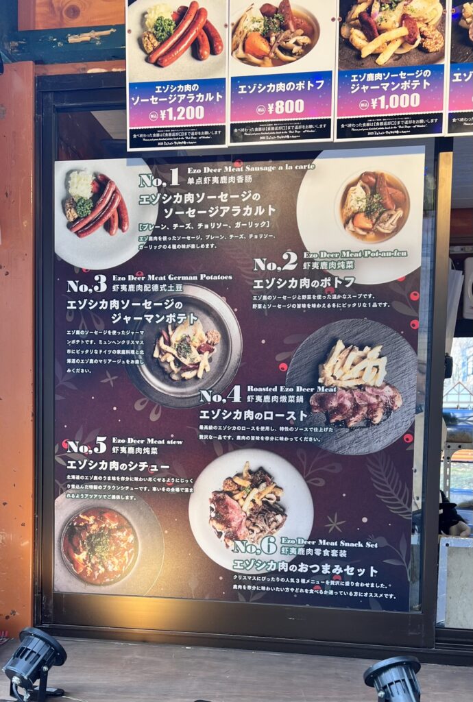 鹿肉のメニューがずらりと並び、香ばしい香りが漂ってきて、どれも食べてみたくなります。
