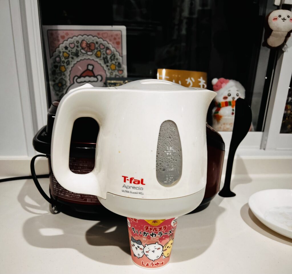 ティファールをラーメンの上に乗っけて3分待つのが儀式w