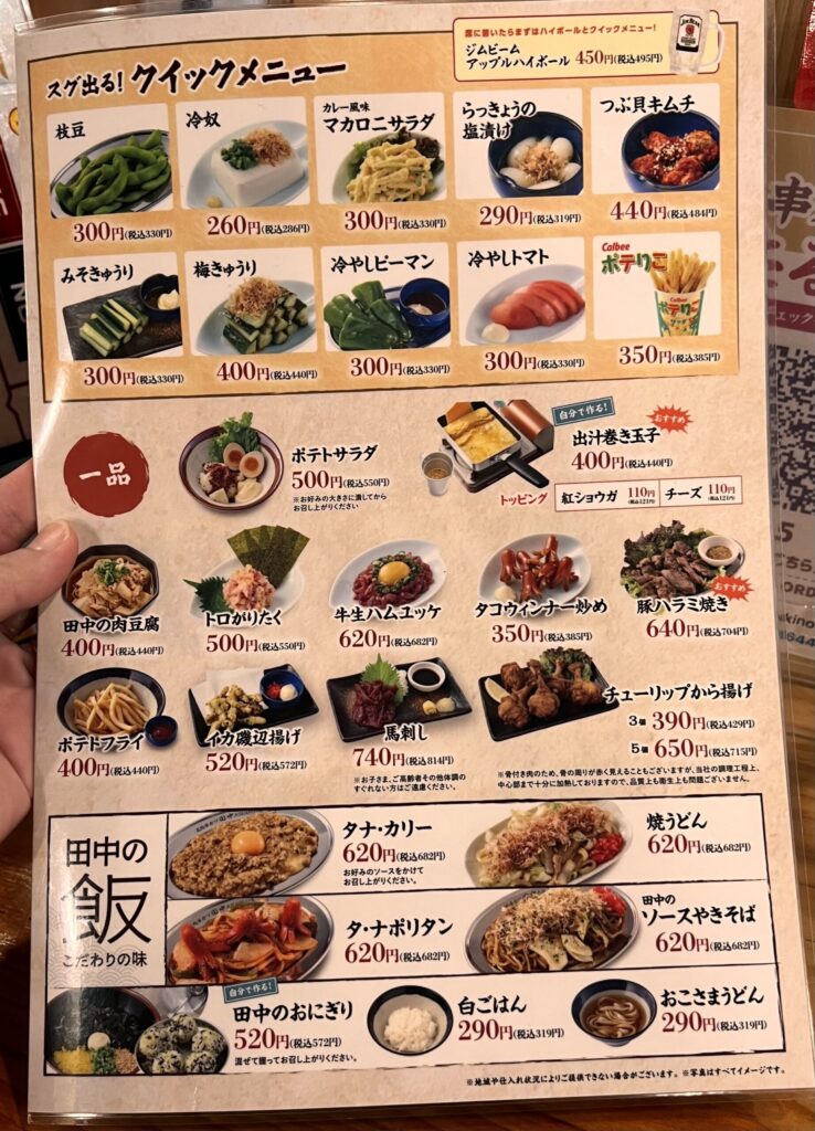 締めメニューも充実していて、田中のおにぎりに焼きそば、ナポリタンなど、どれを選んでも間違いなさそう。