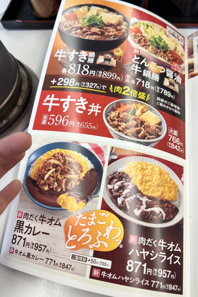 メニューをペラっとめくると「肉だく」のカレーとハヤシにも心奪われる(笑)さらに右のページには通常メニューもあり、お口は牛丼を欲している。いやいや!迷ってはいけない!決めてきたのを曲げると後悔!するので、メニュー観察を切り上げ店員さんを呼びますw