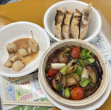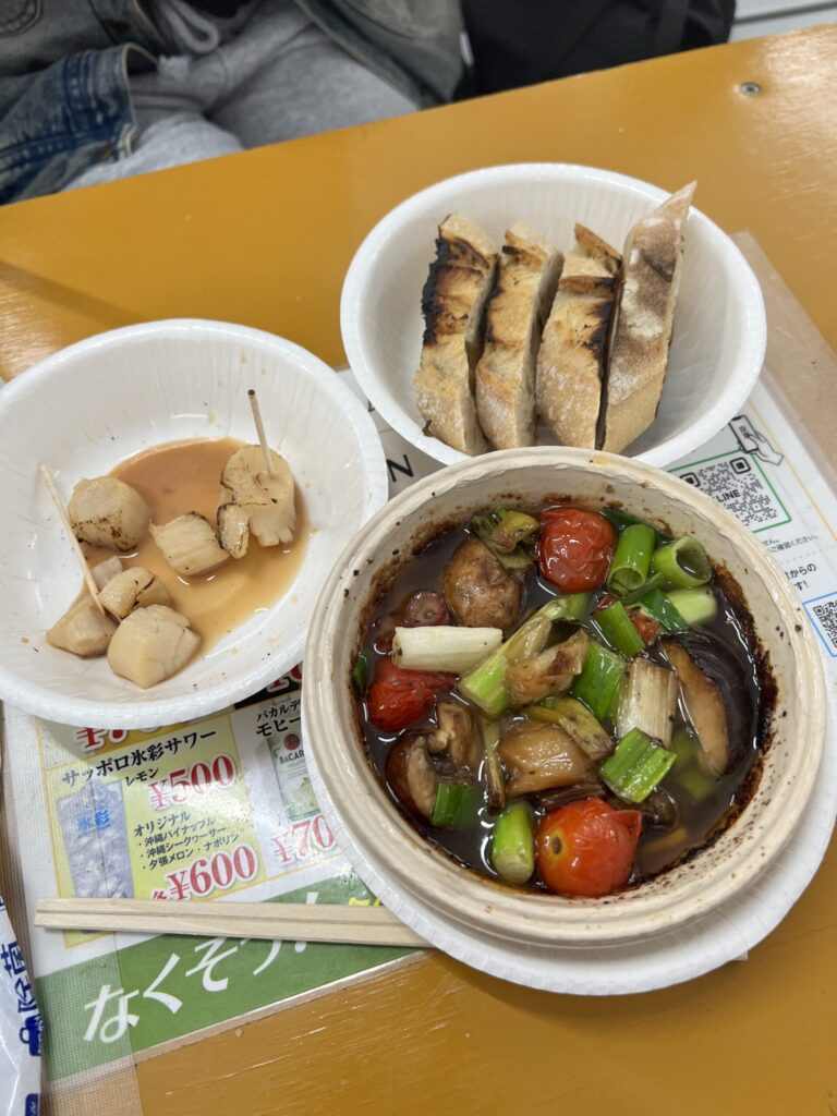 8丁目は毎年、ほっかいどうの美味いものがぎゅっと集まるエリアだから、席がなかなか空いていないことも。食べ歩きでおつまみを集めながら、空席を探してキョロキョロ…すると、ラッキーなことに2人分の席を発見!すぐに座って乾杯です🍺🥂