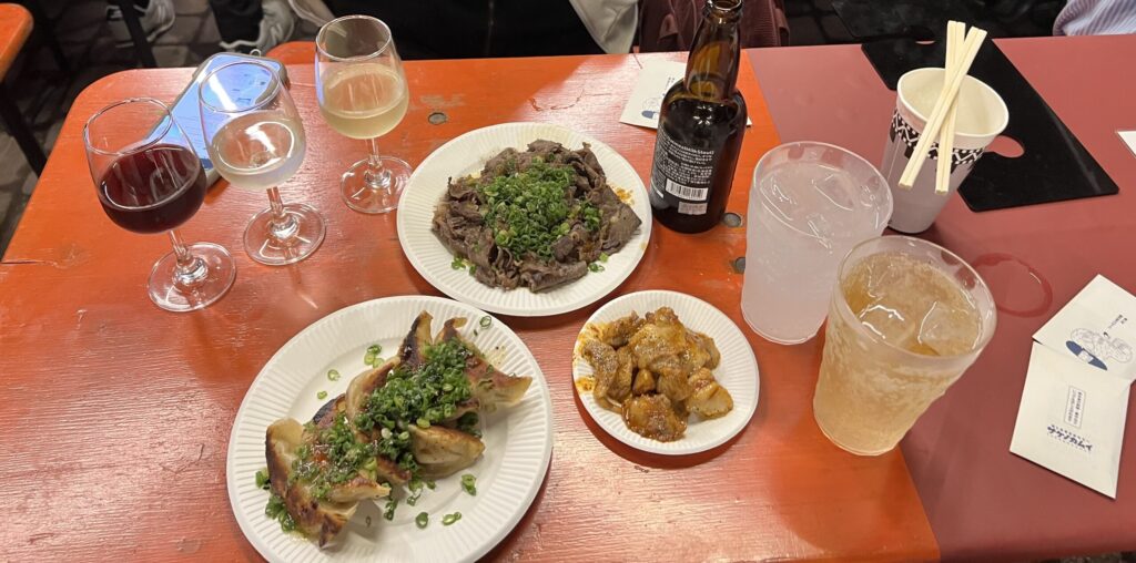 親友やんの飲み比べワインに、私のハイボール&レモンサワー、そして看板の餃子〜ホルモン〜炙りカルパッチョまで、全部「おいしいーー!!」連発でした。