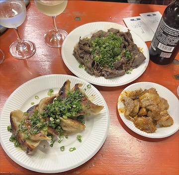 親友やんの飲み比べワインに、私のハイボール&レモンサワー、そして看板の餃子〜ホルモン〜炙りカルパッチョまで、全部「おいしいーー!!」連発でした。