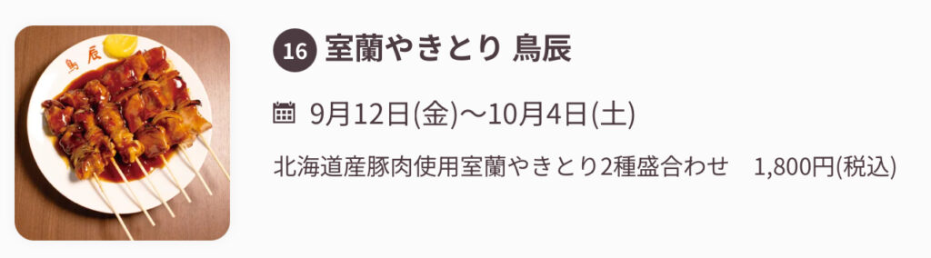 (お店の写真をまたもや忘れてました、てへぺろ)(オータムの公式HPより写真)一方、私(亀さんを)は北海道ならではの味をもう一つ!室蘭やきとりの「鳥辰」で、香ばしい焼き鳥をチョイス🍢