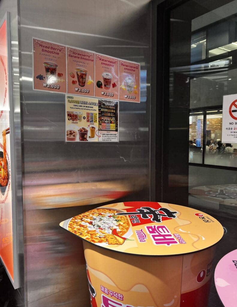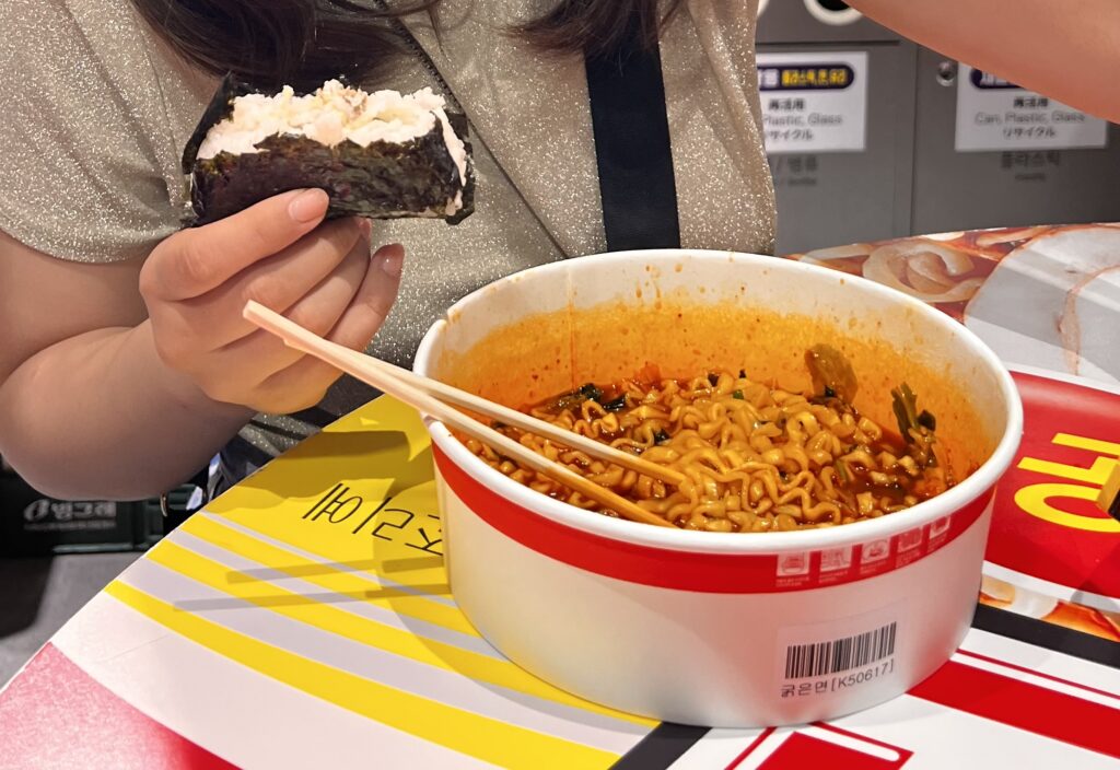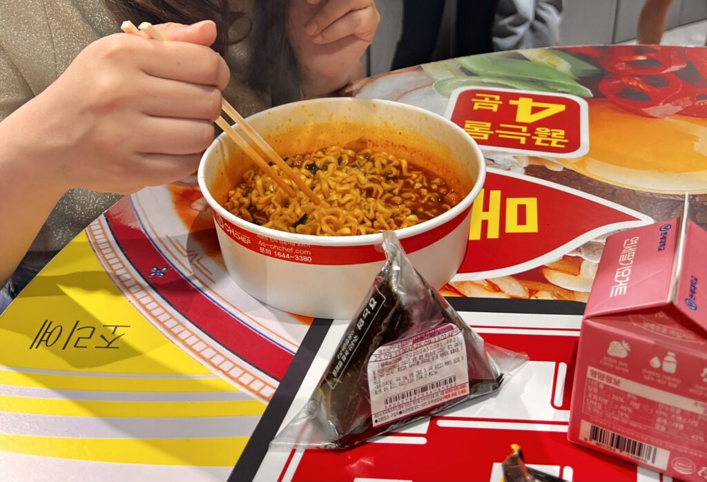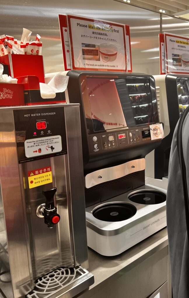 店内の奥にひっそり置かれたハイテクステーションを見つけちゃいました。カップ麺をセットすると自動でお湯を注いでくれて、待ってるだけで出来上がるなんて驚き!そして、袋麺を美味しく手軽に食べる文化すごく韓国ぽいよね〜✨