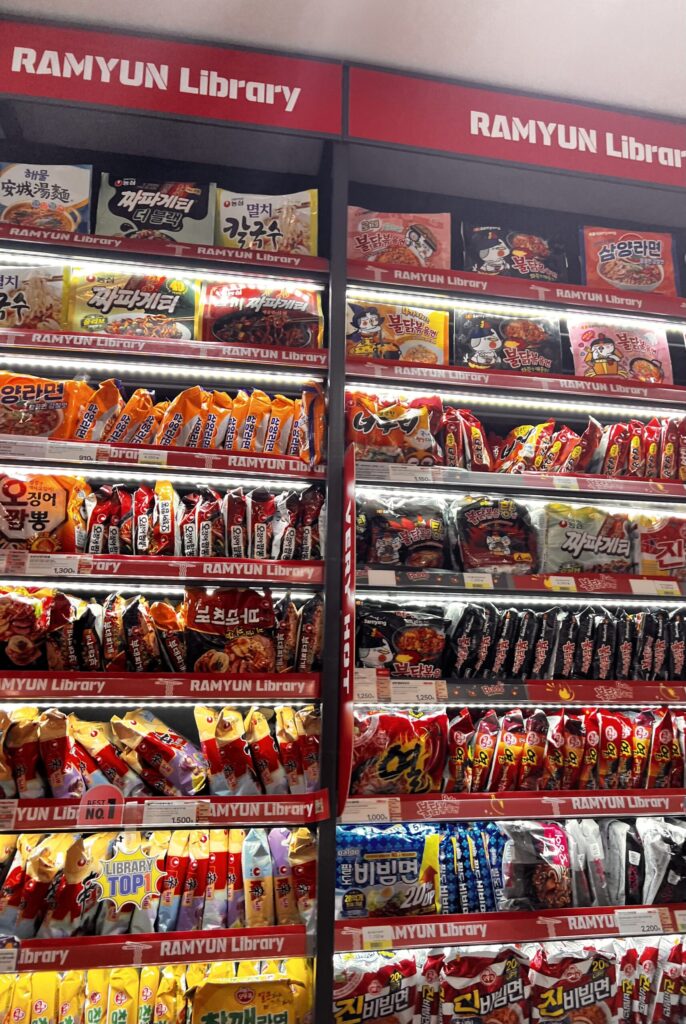 「RAMYUN Library(ラミョンライブラリー)」の名の通り、棚いっぱいにカラフルな袋ラーメンがずらり😳✨