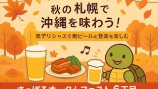 徒然 秋の札幌で沖縄を味わう!6丁目奏デリシャスで地ビールと音楽を楽しむ🍁オータムフェフト! さっぽろオータムフェスト2025・6丁目会場「奏デリシャス」で沖縄料理とクラフトビールを堪能!美深白樺ブルワリー「夜遊び」やゴーヤチャンプルーなど本格グルメに舌鼓。秋の札幌でジャズの音色を聴きながら、ご機嫌な夜を過ごしたレポートをお届けします。 2025.09.30 徒然